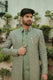 Caded blue all over thread and sequence embroidered sherwani with matching silk kurta and cotton lycra pant.